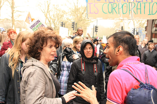 Farta de ouvir os protestos futeis das crianças como "Bankers Wankers", ela foi sem medo dirigir-se ao que mais falava e perguntou se ela sabiam porque estavam todos ali. Ele começou com conversas que era contra os banqueiros não pagarem a crise e contra a guerra e tudo o que ele teve a decorar dos vários folhetes de propaganda. Ele respondeu: