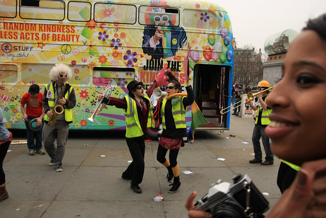 Em trafalgar square o protesto era um pouco diferente. Um double-decker convidava "join the kindness offensive". Voluntários ofereciam música, festa e free hugs.